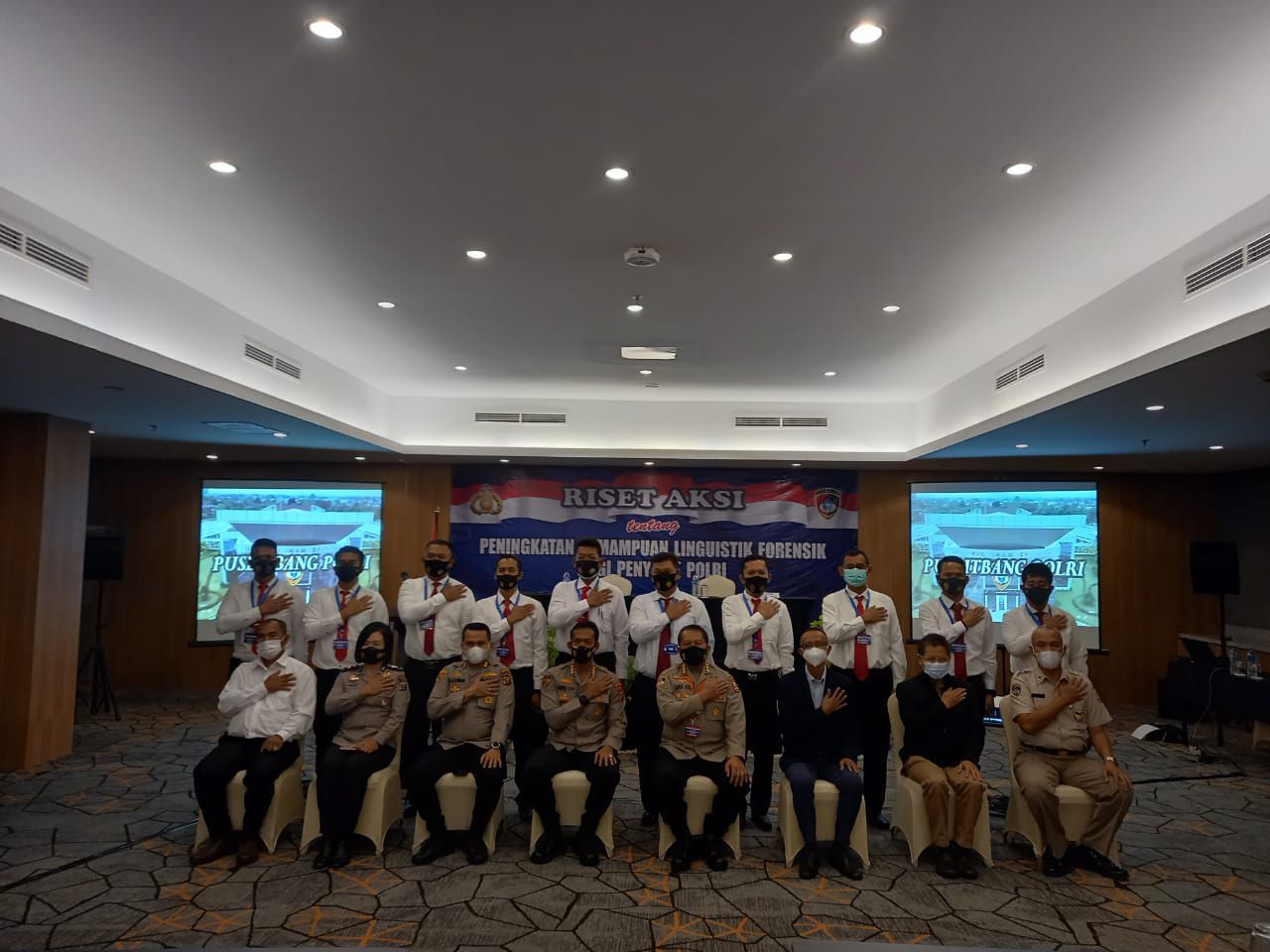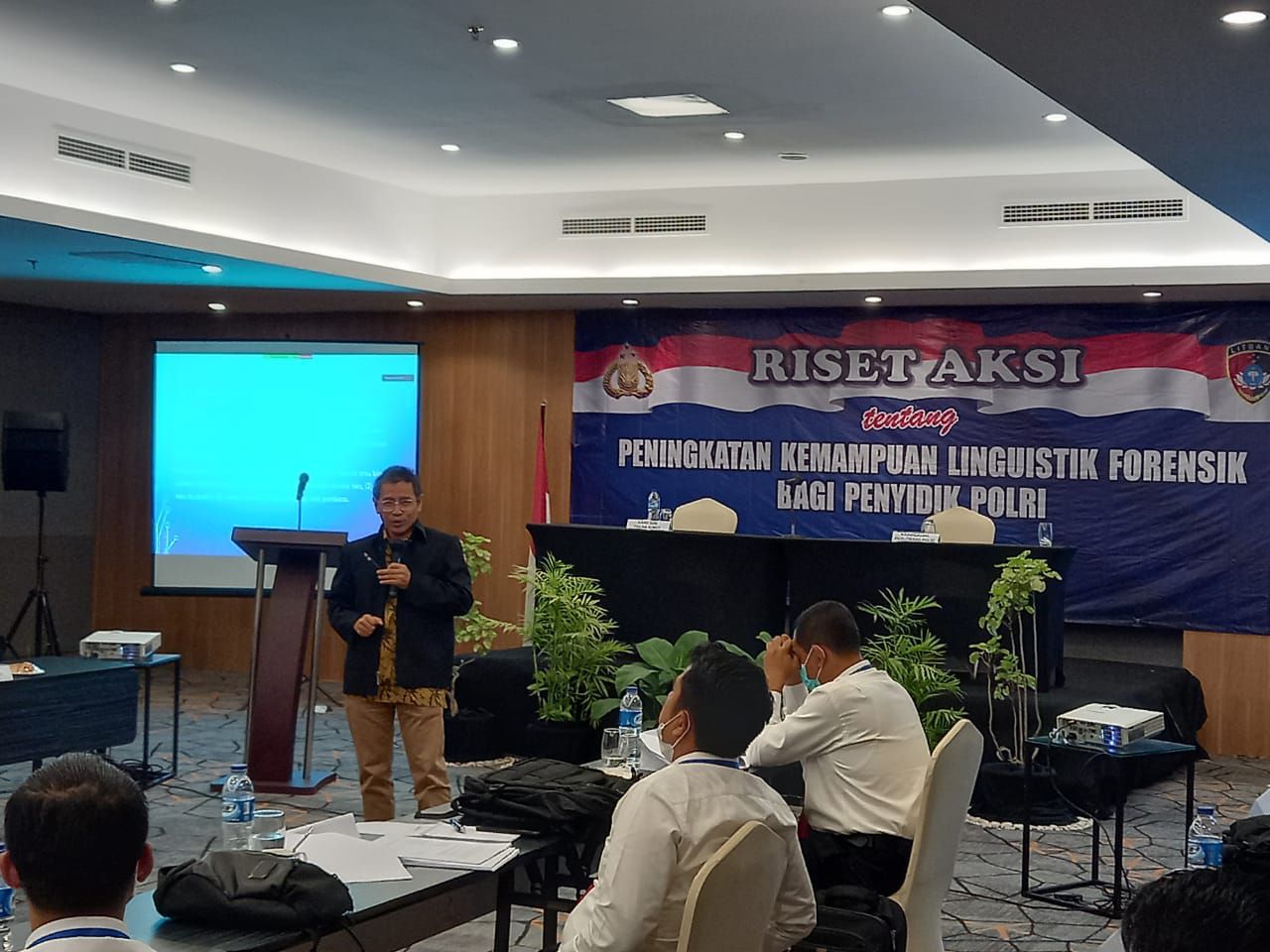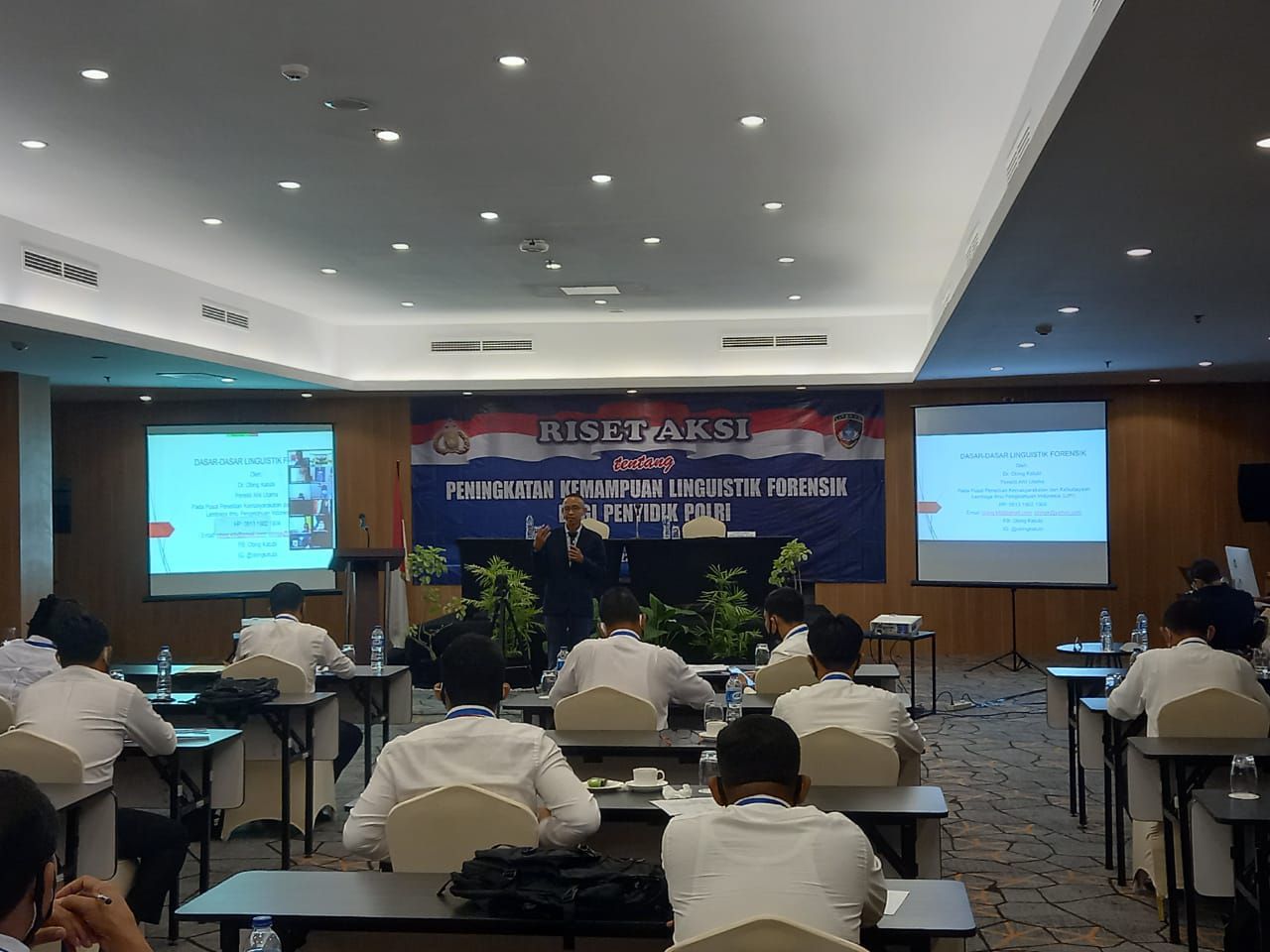 Riset aksi ini dipimpin Kabidgasbin Kombes Pol. Drs. M. Asrul Aziz, M.A.P. dan didampingi konsultan dari Peneliti LIPI Dr. Obing Katubi, M.Hum mengenai "Pengenalan linguistik forensik", "Bahasa dan hukum", dan "Bahasa sebagai bukti". Kemudian dilanjutkan pembahasan mengenai "Analisis Gramatikal" dengan pendekatan Forensik oleh Dr. M. Umar Muslim, M.A. dan melakukan pelatihan transkripsi forensik.