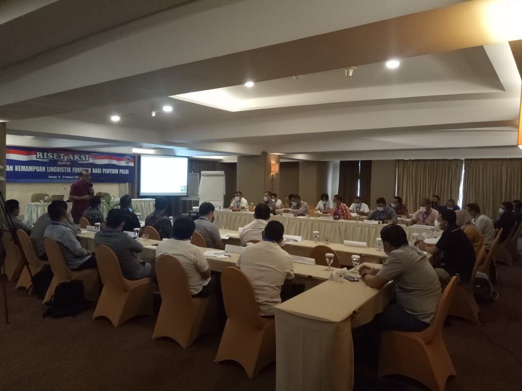 Riset aksi ini dipimpin Kabidgasbin Kombes Pol. Drs. M. Asrul Aziz, M.A.P. dan didampingi konsultan Dr. Totok Suhardiyanto, M.A. yang menyampaikan tentang "Analisis stilistik dan variasi", "Bahasa pada kasus pidana", "Bahasa pada kasus perdata", dan "Perbandingan penulisan".