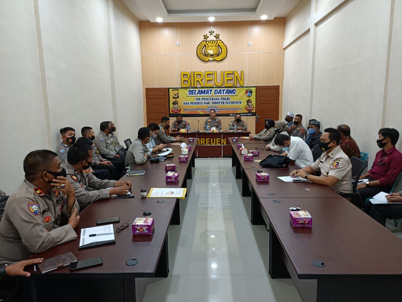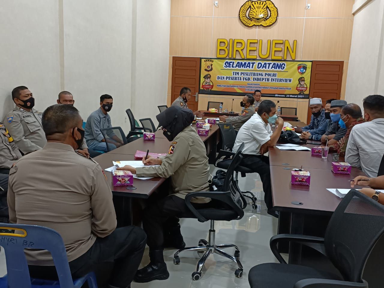 Puslitbang.Polri.go.id - Bid Gasopsnal Pusat Penelitian dan Pengembangan Polri melaksanakan penelitian "Tingkat Kepercayaan Masyarakat Terhadap Kinerja Polri" di Polres Bireun yang dipimpin Analis Puslitbang Polri Kombes Pol. Saefudin Mohamad, S.I.K., Selasa (23/3).