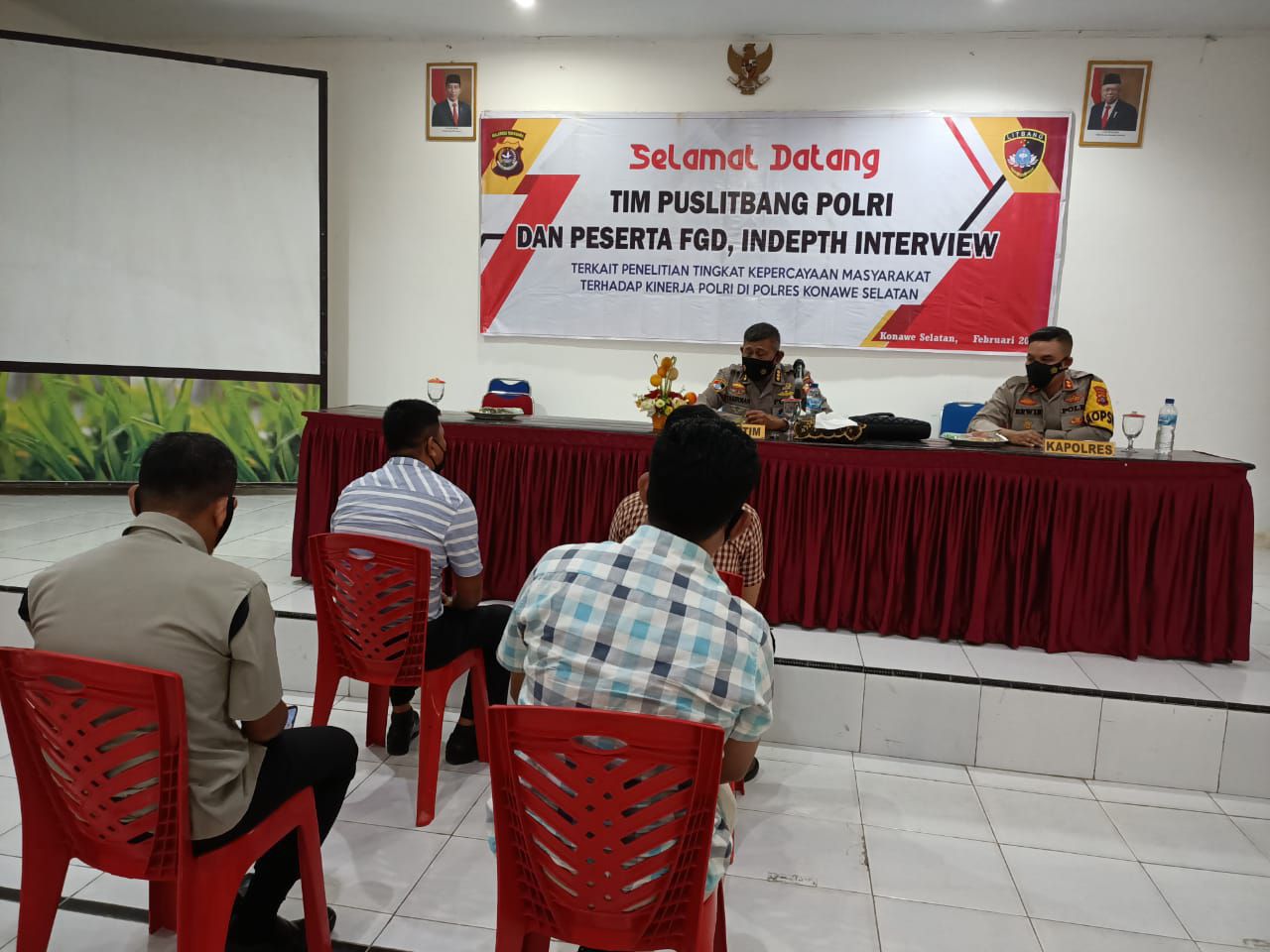 Puslitbang.Polri.go.id - Bid Gasopsnal Pusat Penelitian dan Pengembangan Polri melaksanakan penelitian "Tingkat Kepercayaan Masyarakat Terhadap Kinerja Polri" di Polres Konawe Selatan yang dipimpin Analis Puslitbang Polri Kombes Pol. Drs. Yasirman, Selasa (16/2).