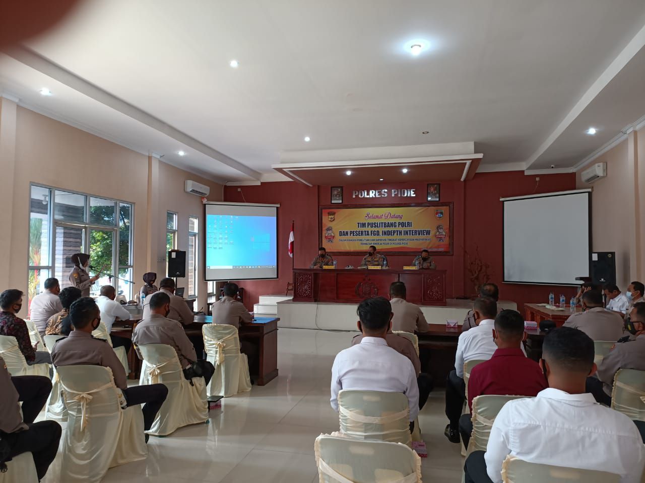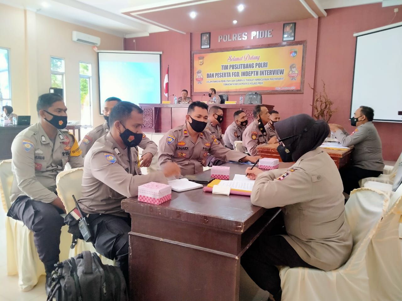 Puslitbang.Polri.go.id - Bid Gasopsnal Pusat Penelitian dan Pengembangan Polri melaksanakan penelitian "Tingkat Kepercayaan Masyarakat Terhadap Kinerja Polri" di Polres Pidie yang dipimpin Analis Puslitbang Polri Kombes Pol. Saefudin Mohamad, S.I.K. dan disupervisi Sespuslitbang Polri Kombes Pol. Iswyoto Agoeng Lesmana Doeta, M.Si., Senin (22/3).