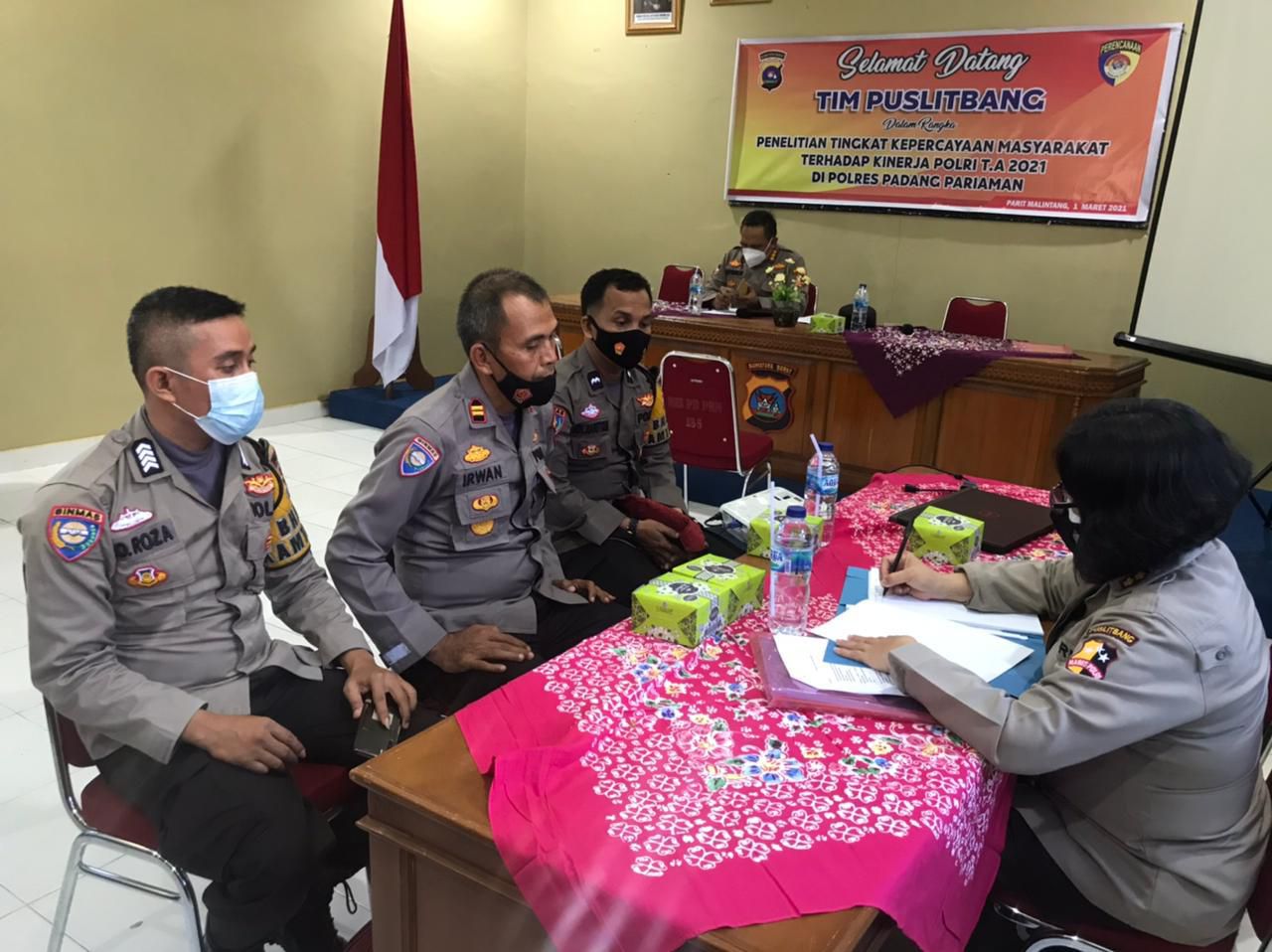 Puslitbang.Polri.go.id - Bid Gasopsnal Pusat Penelitian dan Pengembangan Polri melaksanakan penelitian "Tingkat Kepercayaan Masyarakat Terhadap Kinerja Polri" di Polres Padang Pariaman yang dipimpin Analis Puslitbang Polri Kombes Pol. Saefudin Mohamad, S.I.K., Senin (1/3).