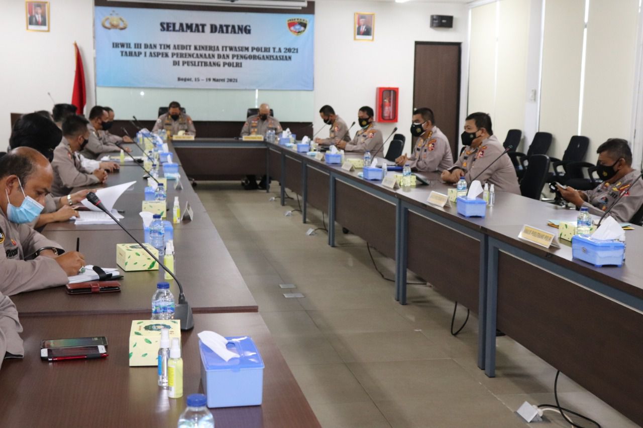 Puslitbang.Polri.go.id - Inspektorat Pengawasan Umum Polri menggelar Audit Kinerja pada Satuan Kerja Pusat Penelitian dan Pengembangan Polri, Bogor, Senin (15/3).
