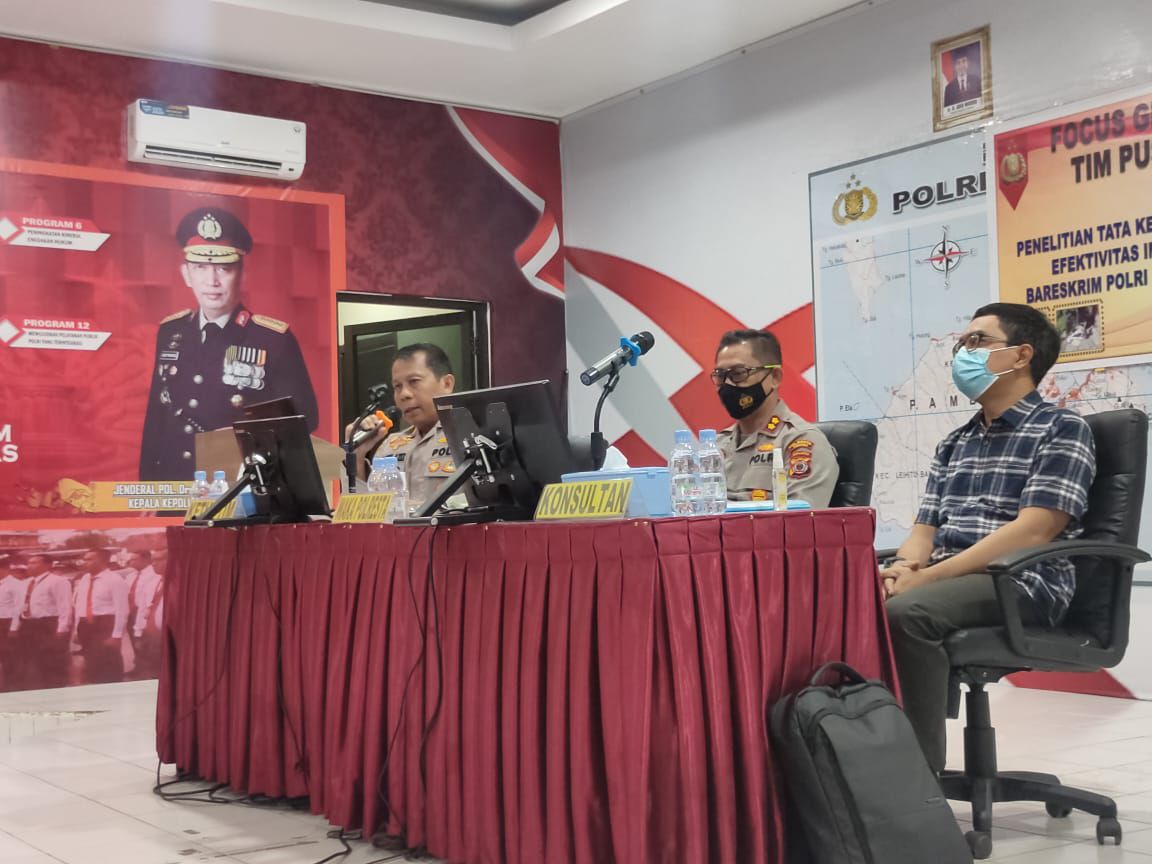 Puslitbang.Polri.go.id - Bid Gasbin Pusat Penelitian dan Pengembangan Polri melaksanakan penelitian "Efektivitas implementasi sistem organisasi tata kerja (SOTK) Pusinafis Bareskrim Polri" di Wilayah Polres P. Ambon & P.P. Lease yang dipimpin Kabidgasbin Kombes Pol. Drs. Asrul Aziz, M.AP., Rabu (16/6).